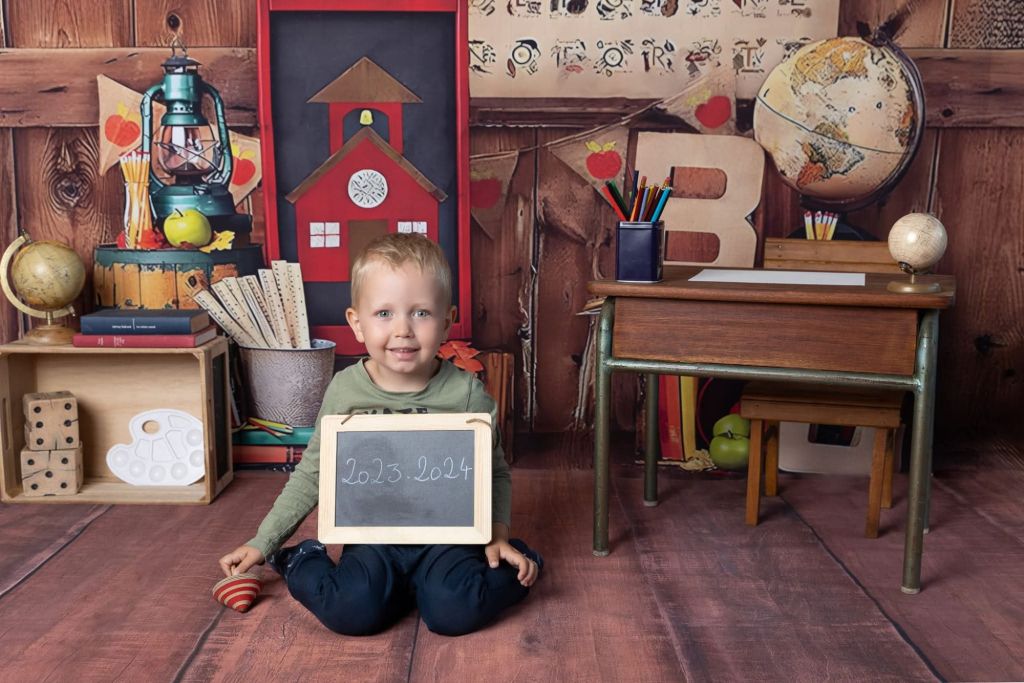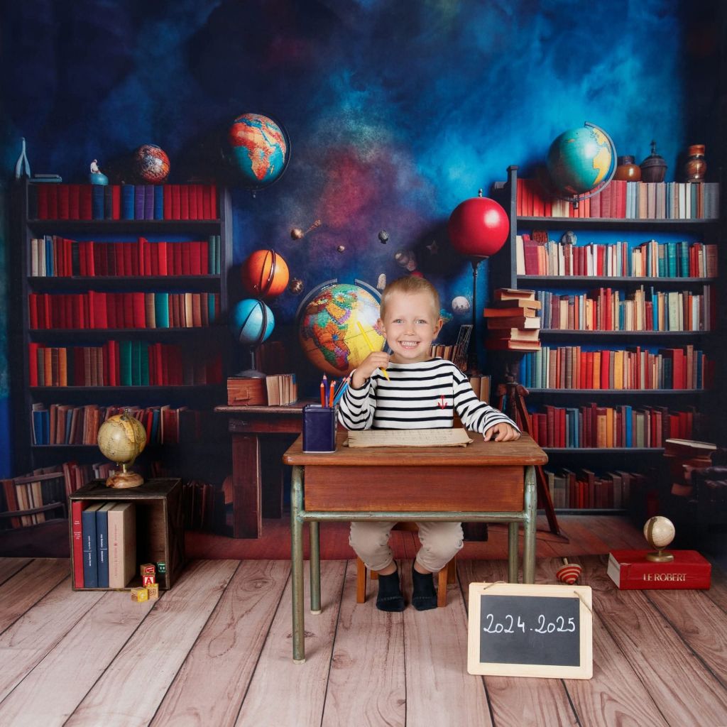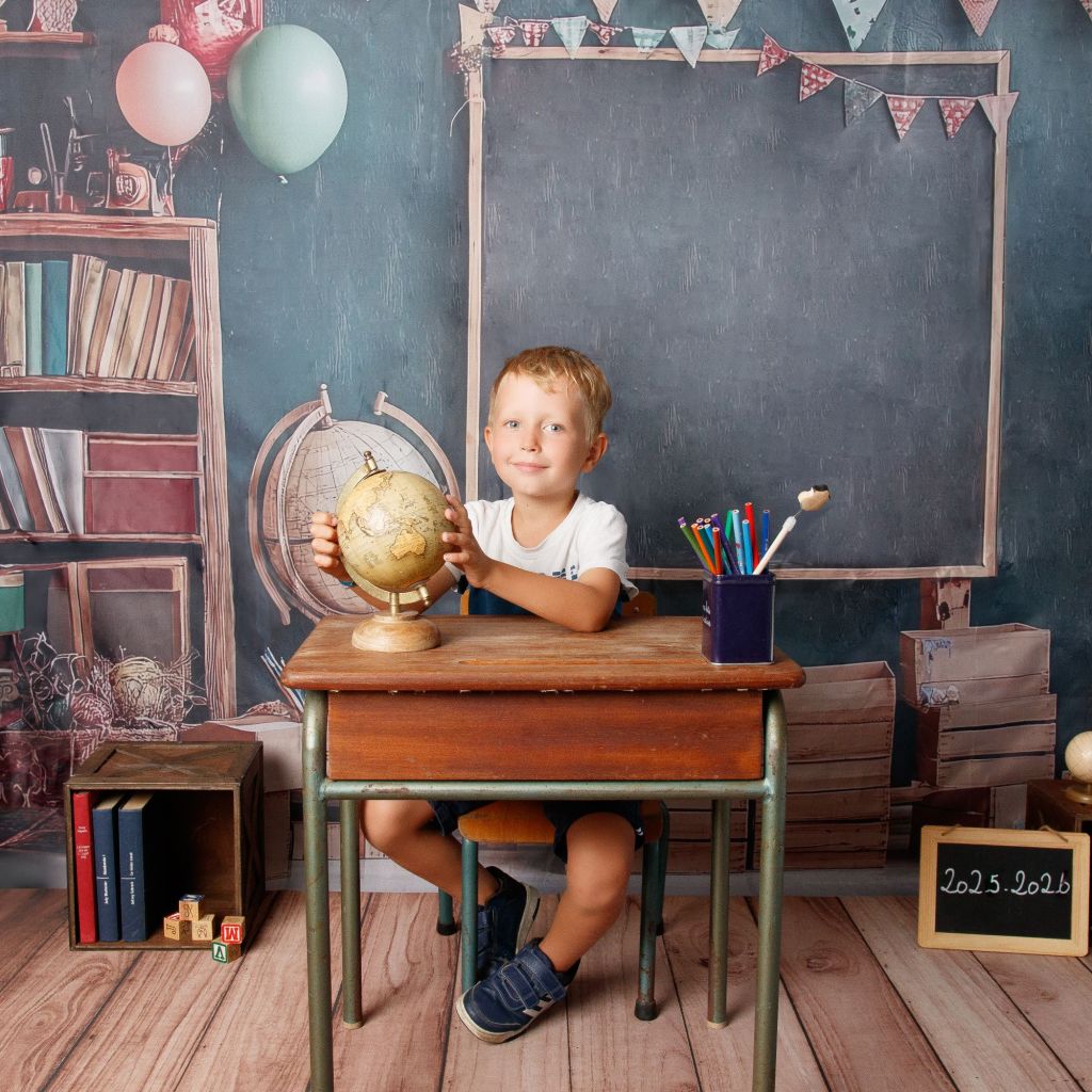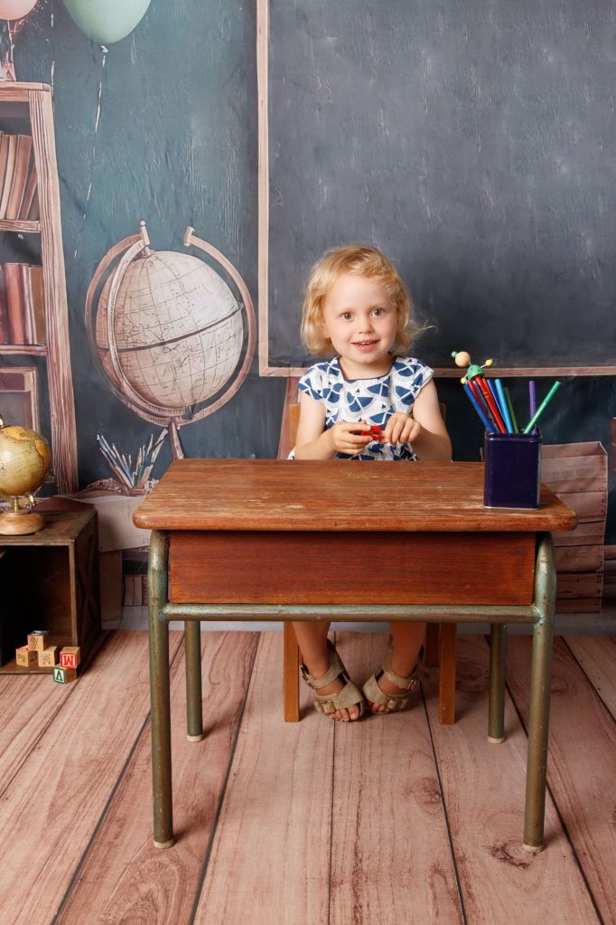 • Créer des photos thématiques avec un décor adapté :tableau noir, bureau d’écolier, globe terrestre, livres-