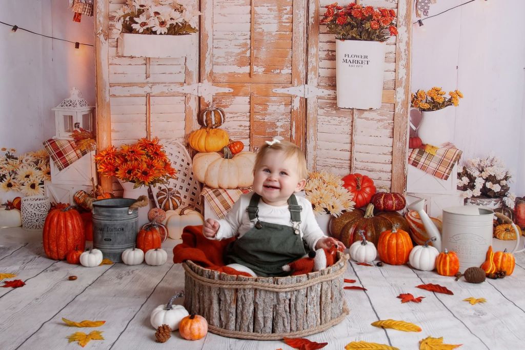 Lors de cette séance photo d’automne pour bébé, il est possible de créer un décor poétique rempli de citrouilles, de fleurs aux tons orangés