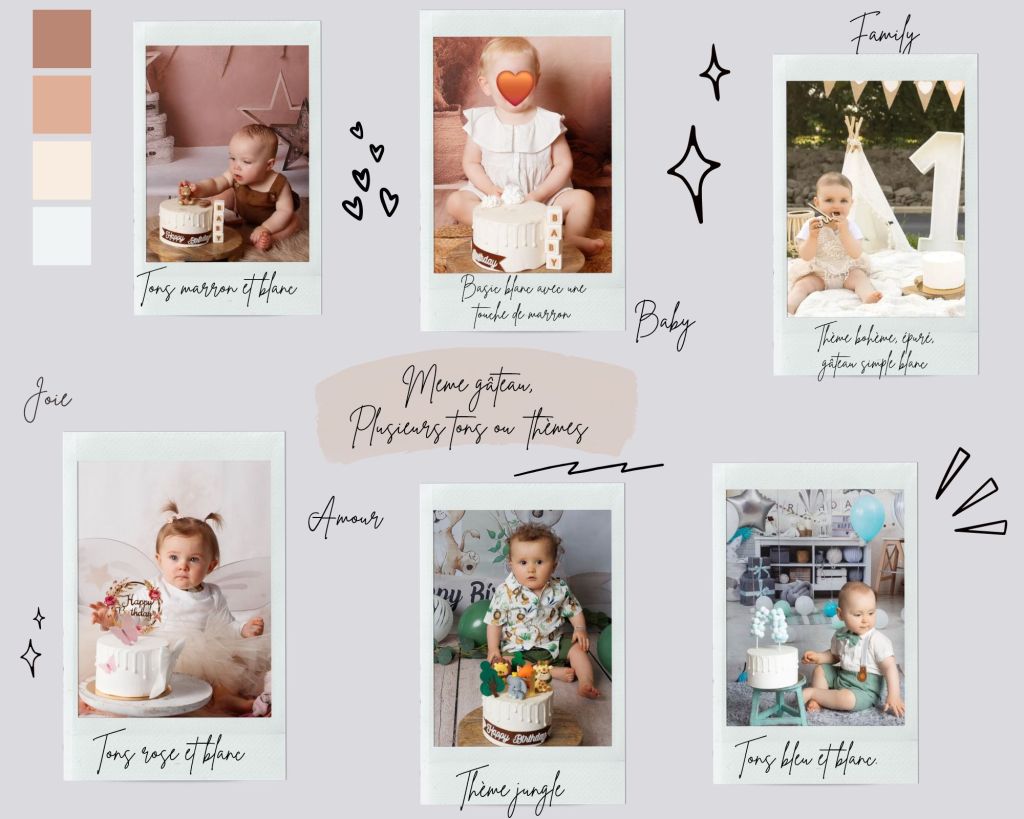 En ce qui concerne les séances « smash the cake » avec vrai gâteau, je ne le fourni pas, le vrai gâteau est fourni par les parents.